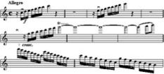 Совсем другой характер detache мы встречаем в Тройном Концерте Л.Бетховена (пример 9). Стремительные гаммы, подводящие к заключительным аккордам, требуют не только артикуляции приемом detache, но и, для большей яркости, так называемого обратного штриха, когда звуки, приходящие на сильную долю, исполняются вверх смычком: