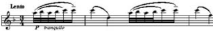 Возвращаясь к штриху portato и его родственности с декламационным legato, хочется привести пример из Концертной фантазии П.Сарасате на темы из оперы Кармен Ж.Бизе, ор. 25 (примеры 10 и 11). Импульсная вибрация в левой руке вместе с мягким отделением звуков при помощи смычка (акцентированные ноты в примере 10) наиболее полно выражают то ожидание трагедии, которая наступит в 13-м такте этой части Фантазии. С 38 такта, когда тема проходит в первой октаве (пример 11), аналогичная фраза звучит как воспоминание, и здесь уже три восьмушки исполняются на один смычок мягким portato. Оба этих случая - и декламационное detache, и portato - соответствуют той артикуляционной характеристики, которая отмечена в нашей классификации пунктом IV.