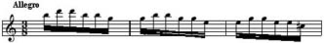 Я уже упоминал о декламационном detache, когда речь шла о Концертной фантазии П.Сарасате. Эта разновидность штриха, в отличие от portato, применяется не только в медленных и умеренных темпах, но и в быстрых, когда характер музыки требует четкого произнесения каждого тона фразы, но без паузы между ними. Такой характер артикуляции присущ скрипичным сочинениям И.С.Баха (пример 14):