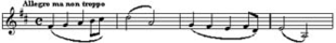 Очень часто в нотной литературе встречаются такие виды portato, когда требуется отделить залигованные на один смычок одинаковые ноты. С таким видом portato скрипачи начинают сталкиваться на самых ранних этапах обучения, когда изучается, к примеру, Сурок Л.Бетховена (пример 12). Сложность исполнения связных звуков мягкой декламацией смычка часто заменяется учеником другим видом артикуляции, когда смычок останавливается перед залигованной восьмой.
