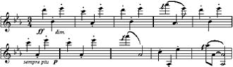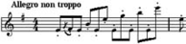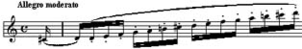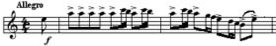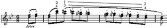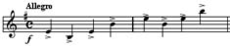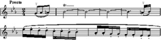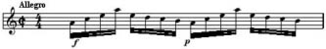 Дальнейшее усиление межтоновой артикуляции приводит к так называемому маркированному detache . Разделительную функцию здесь выполняют и акцентированно-активная атака, и ослабление звучания к концу ноты. Причем пауза между тонами по-прежнему отсутствует. Ярким примером такого артикулирования служит начальная тема Прелюдии и Аллегро в стиле Пуньяни Ф.Крейслера (пример 17):