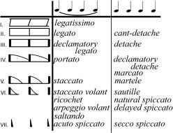 Разумеется, резких акустических границ, отделяющих артикуляцию тонем одного ряда от тонем другого, нет. Однако, в тех музыкальных произведениях, где встречаются все эти артикуляторные типы, они достаточно четко выражены. Чтобы подчеркнуть отсутствие резких артикуляционных границ между отдельными типами штрихов, в таблице эти типы не разделены специальными линиями.