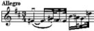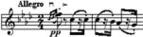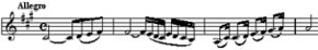 Если в Концерте И.Брамса прямой штрих выявляет масштабность звучания, то пунктирный ритм в Концерте Я.Сибелиуса, исполняемый обратным штрихом, характерен стремительностью, полетностью (пример 53).
