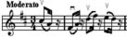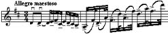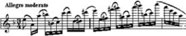 Пример 51.d - Пунктирный ритм без паузы между залигованными нотами пары. Велико разнообразие музыкальных характеристик, которые озвучиваются этим видом артикуляции. Так в Концерте А.Вьетана кантиленный пунктирный ритм (пример 56) характерен своей речевой выразительностью, а в Полонезе Г.Венявского (пример 57) тот же ритм выявляет стремительность бравурного танца.