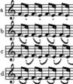 Пары, объединяющие тоны одинаковой длительности, могут быть хореическими (хорей - вид артикуляции, когда первая нота сильная, а вторая - слабая) или ямбическими (ямб - вид артикуляции, когда первая нота слабая, а вторая - сильная). Причем, длительность одной ноты из пары может быть полноценной или укороченной за счет точки под нотой (staccato) или выписывания укороченной длительности с соответствующей паузой.