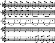 Если любая нота из пары может быть разбита на более мелкие длительности, как это мы видели в примере из Рапсодии Б.Бартока, то перечень ямбических и хореических попевок значительно увеличится. Но даже и в этих случаях сохраняются все те же положения, отмеченные нами в примере 45.