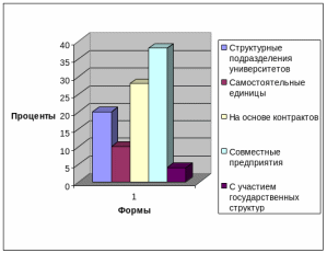 Основной особенностью американских технополисов и технопарков является их тесная связь с университетами и государственными исследовательскими центрами. При этом формы взаимодействия отличаются существенно. Так, 20% технопарков созданы университетами как их структурное подразделение, 10% - как самостоятельные единицы, 28% -- на основе контрактов с разработчиками инновационных проектов, 38% -- как совместные предприятия и только 4% составляют технопарки с участием государственных структур (рисунок 1).