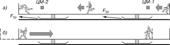 Проще представить себе не машину, а самих себя, поэтому пусть корпусом инерцоида будет служить длинная тележка на опорах с очень малым трением (коньки на льду!), а грузом – непосредственно мы сами (рис. 3). Медленно и осторожно разбегаемся (а), набираем скорость, и вот мы уже у передней стенки тележки. Она не двинулась, так как ускорение наше слишком мало, касательная сила ног на пол слабая, и сила трения коньков о лед, как бы ничтожна ни была, удержала ее от движения назад. И все же эта сила трения двинула наш инерцоид, хотя корпус и неподвижен. Ведь общий центр масс системы «груз (человек) – корпус» переместился с положения ЦМ-1 в положение ЦМ-2. Вот оно, истинное движение инерцоида. И движение это – благодаря внешней силе трения Fтр, направленной со стороны льда на коньки именно вперед, по движению центра масс!
