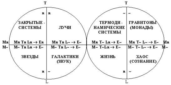 М - материя, Т- самодвижение во времени, L - самодвижение в пространстве, n - дискретное, ~ - непрерывное.