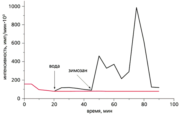 Влияние зимозана (0.2 мг/мл), стимулятора фагоцитоза, на хемилюминесценцию губки Sycon sp.