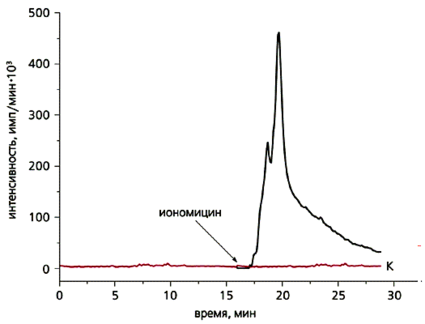 Усиление хемилюминесценции губки Sycon sp. под действием иономицина (0.3 мкМ).
