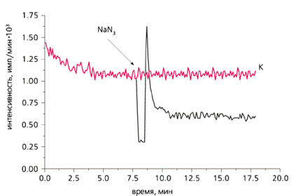 Изменение хемилюминесценции актинии Aiptasia pulchella после добавления азида натрия (1 мМ) - ингибитора гемсодержащих ферментов.