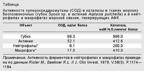 Теперь необходимо было убедиться в том, что генерация АФК морскими беспозвоночными представляет собой активный процесс, а не пассивную утечку вследствие слабой активности каталазы, как происходит у пресноводной рыбы пецилии [9]. Поэтому мы измеряли активности основных антиоксидантных ферментов - супероксиддисмутазы (СОД) и каталазы в гомогенатах актиний и губок. Подобно нейтрофилам и макрофагам, эти животные обладают антиоксидантными ферментами, которые защищают их от повреждающего действия АФК. Однако с генерированием АФК наружными поверхностями актиний и губок такая защита не сбалансирована. У этих беспозвоночных животных активности таких ферментов довольно высоки в сравнении с теми, которые характерны для “профессионально” генерирующих АФК клеток млекопитающего - макрофагов и нейтрофилов морской свинки. Следовательно, можно было исключить пассивную утечку АФК в качестве единственного способа их удаления (таблица) [10].