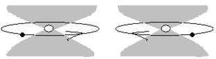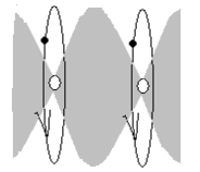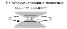 В модели атома, которую предлагает автор, не требуется использовании дополнительной силы для объяснения природы связи двух атомов водорода и при этом имеется очевидное физическое представление этой связи. И так, не экранизированные полюсные зазоры атома имеют направленные вращения зарядных полей электронов. На условном рисунке 4 затемненная область показывает не экранизированные полюсные зазоры. При совпадении направления вращения полюсов не экранизированные полюсные зазоры атомов притягивают полюсные электроны друг друга см. рисунок 5.