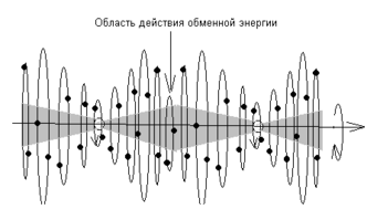 Рассмотрим последнее утверждение подробнее. Ток создается движением электрических зарядов, значит и движущиеся по орбитам вокруг ядра в атоме электроны представляют собой кольцевые микротоки и они должны создавать вокруг себя магнитное поле. Атомы стягивает магнитное взаимодействие однонаправлено вращающих электронов. Каждый электрон вокруг ядра атома является элементарным магнитиком. Магнитный момент электрона, движущегося по орбите, перпендикулярен плоскости орбиты. Полюсные электроны двух атомов создадут общую орбиту, если будут иметь разно направленные спины. И эта электронная орбита будет принадлежать обоим взаимодействующим атомам. И так обменная энергия состоит из трех составляющих: