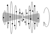 Автор считает, что принцип минимума энергии не является определяющим при построении электронной конфигурации атома, так как количество энергии электрона является следствием нахождения электрона на соответствующем уровне. То есть не электроны строят оболочку атома, а атомное ядро из электронов строит свою оболочку. Вроде бы нюанс, но очень важный, так как позволяет ввести как основной принцип построения электронной структуры, физическое явление, которое хорошо известно в физике плазмы, но которое до сих пор не учитывается при теоретическом построении электронных конфигураций атомов. Это эффект экранизации заряда атомного ядра зарядом электрона. Но с существенным дополнением, с учетом соотношения их размеров. Объемный размер электрона ничтожно мал относительно объемных размеров атомного ядра и эта разница увеличивается с увеличением заряда атомного ядра еще на три порядка. А это очень существенный фактор. Так как, дает возможность предположить, что интенсивность экранизации заряда атомного ядра максимальна именно по орбите вращения электрона рис. 2. С резким уменьшением экранизации в направление полюсов. С одной стороны электрон будет проявляться, при столкновениях, как частица, обладающая неделимым зарядом и массой. В то же время электрон, как движущая точка экранирования заряда ядра, будет распространяться подобно волне обладающей определенной частотой и определенной длиной. То есть с вводом понятия локальной экранизации заряда ядра зарядом электрона, квантово-волновой дуализм электрона приобретает очевидный физический смысл.