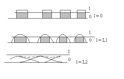 Можно видеть, что сигнал читается и в случае “уширенного импульса” (средний график), так как а нем присутствуют уровни единица-нуль. Приемник же нормализует сигнал, превращая его опять в прямоугольный. И вобще, если кто-нибудь видел на осциллографе форму цифровых сигналов ЭВМ, тот знает, что эти сигналы – совсем не прямоугольные, а ближе к отрезку синусоиды. Таким образом, для предачи цифровой информации форма сигнала совершенно не обязательно должна поддерживаться прямоугольной. Очевидно также, что наличие “составляющих сколь угодно высоких частот с ничтожно малой амплитудой”, даже сильно опережающих или отстающих от несущей и полностью с ней рассинхронизированых будут проявляться как шумы и на сигнал не скажутся никак!