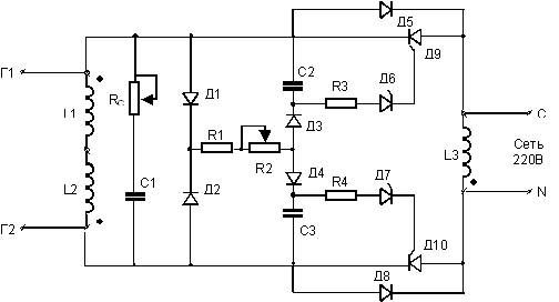 Д9, Д10 – тиристоры, подключающие нагрузку L3 (при подключенной сети) к колебательному контуру два раза за период в заданные моменты времени относительно начала периода;