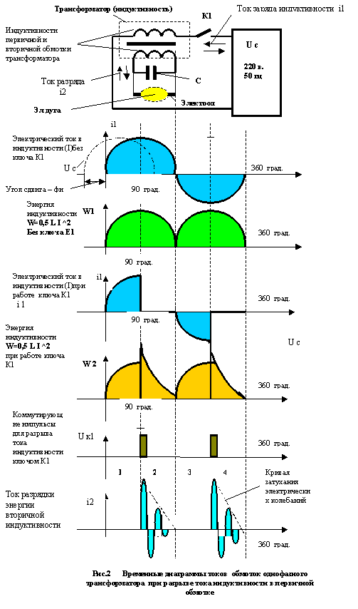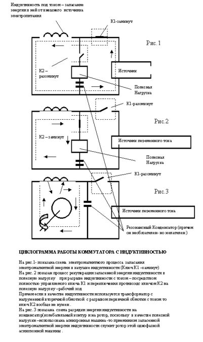 На рис1,2-показано запасание электромагнитной энергии в индуктивности с током и потом разрыв индуктивного дросселя с током быстродействующим ключом - и потом переключения ее на контур с электрической полезной нагрузкой – в котором показана работа электрического тока, возникающего при разрыве индуктивности с током- от противоэдс, в этом новом контуре на полезную нагрузку.