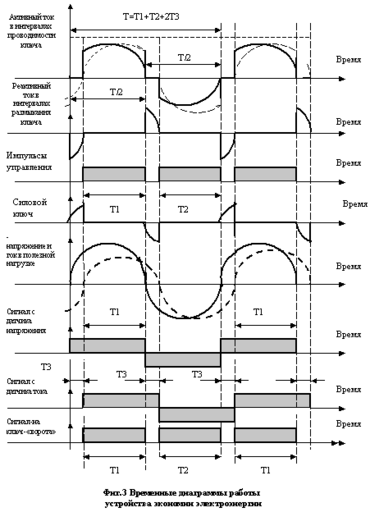 Этот метод назван мною- метод циркуляции реактивных токов . Для его реализации необходимы в фазах индуктивной нагрузки полностью управляемые ключи – например, на транзисторах . Отметим , что сумма за период индуктивных фазных токов в фазах трехфазной электрической машины –равна нулю. Это обстоятельство позволяет сделать циркуляцию реактивных токов вообще без компенсирующих конденсаторов, а с помощью полностью управляемых силовых ключей, например посредством силовых транзисторов. Этот эффект циркуляции реактивных токов достигается за счёт введения оригинального, полностью управляемого регулятора напряжения, включенного в цепи фазных обмоток индуктивных нагрузок (трансформаторов, АЭМ) который посредством устранения контура обмена реактивной энергии индуктивной нагрузки и электрической сети переменного тока достигается эффект автоматической стабилизации входного коэффициента мощности на уровне, близком к единице, при изменении характера и величины нагрузки в широких пределах вообще без силовых компенсирующих конденсаторов. На рис.3 показано предлагаемое устройство экономии электроэнергии в однофазном исполнении, на рис.4 –показано устройство экономии электроэнергии в трёхфазном исполнении.