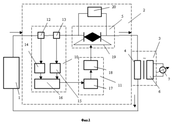 Датчик напряжения 12 и датчик тока 13 присоединены через соответствующие формирователи 14, 15 на входы логической схемы 16 типа “И – НЕ” соответствующий интервалам знакопостоянства напряжения и тока, выход которой присоединён к системе формирования управляющих импульсов 11, содержащей регулятор скважности 17, например, одновибратор, и формирователь импульсов 18, например, типа генератора Ройера, на входы управления силовых вентилей 19 регулятора напряжения 2 зашунтированных встречно включёнными стабилитронами 20.