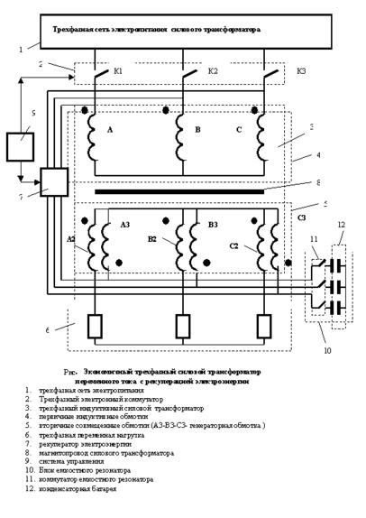 Это устройство экономичного трансформаторного преобразования электроэнергии выполнено по схеме “трехфазный трансформатор – вентильный компенсатор- нагрузка”(рис. Вентильный компенсатор реактивной мощности 2, содержит блок силовых ключей К1-К3, включенных к фазам питающей трехфазной электросети 1 и последовательно в первичные обмотки трехфазного силового трансформатора 3, присоединенного вторичной обмоткой 5 к регулируемой электрической нагрузке 6 Сущность работы такого экономичного трансформатора 3 с совмещенной вторичной индуктивной обмоткой с коммутатором 2 и с рекуператором электроэнергии состоит в том, что при размыкании силовых ключей коммутатора К1-К3 в “реактивные интервалы “ периода возникает явление электромагнитной самоиндукции и происходит под воздействием противоэдс самоиндукции перетекания фазных первичных токов во вторичные обмотки и обратно . причем дважды за период и одновременно возникает эффект циркуляции реактивной энергии через магнитопровод и вторичные обмотки трансформатора 3. Для максимально полной передачи запасенной электромагнитной энергии индуктивностей трансформатора при отключении главного коммутатора 2, в схему этого устройства введен дополнительно и емкостной резонатор 10, содержащий электронный коммутатор и блок резонаторных электрических емкостей. Электрическая схема рекуператора электроэнергии –пока НОУ ХАУ автора. В результате полезного использования запасенной электромагнитной энергии индуктивностей и благодаря принудительной коммутации токов и циркуляции реактивной энергии внутри трансформатора в “реактивные” интервалы экономия электроэнергии потребляемой трансформатором из электросети может достигнуть до 80-100 % !
