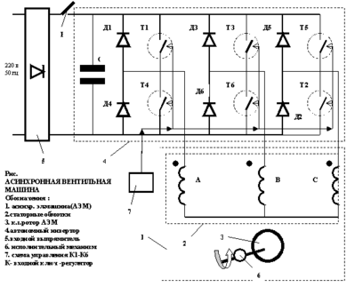 Предлагаемые ниже электрические схемы асинхронных вентильных машин позволяют обеспечить автоматическую циркуляцию реактивных токов по фазам статорных обмоток и рекуперировать электроэнергию на активной мощности с ротора через обратный диодный мост снова на вход электропитания постоянного тока. В этом случае – во входной цепи электропитания ключ К-разомкнут .Максимальная рекуперация электроэнергии достигается при переключении транзисторов в моменты максимума фазных токов электрической машины