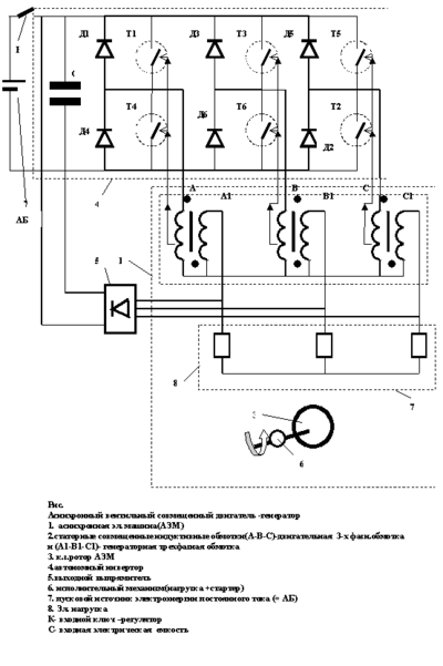 Наиболее распространенный тип АВМ в настоящее время –это трехфазный асинхронный частотно – регулируемый электропривод(АЧРЭП) .Достоинства АЧРЭП состоят в обеспечении широкого диапазона и экономичного регулировании На рис. показана его неполная электрическая схема. Структура АЧРЭП содержит, как правило, входной неуправляемый выпрямитель 5, входной ключ-широтно-импульсный регулятор К, автономный инвертор напряжения (АИН) 4 и асинхронную электрическую машину 1 со статорными обмотками 2 и короткозамкнутым ротором 3. На валу ротора 3 имеется исполнительный механизм (ИМ) 6. В генераторном режиме АВМ в качестве исполнительного механизма применяют иной независимый привод, например ветроколесо Параллельно выходу выпрямителя 5 включена входная фильтрующая электрическая емкость С.. АИН содержит обратный неуправляемый диодный мост Ларионова .собранный на диодах Д1-Д6 и параллельно включенный прямой управляемый трехфазный мост из силовых транзисторов Т1-Т6 с трехфазной схемой управления 7, управляющей частотой и длительностью их включения . Нумерация диодов и транзисторов на схеме АИН соответствует порядку их последовательной работы Благодаря звену постоянного тока – в такой АВМ отсутствует циркуляция реактивной мощности между АЭМ и питающей сетью переменного тока В результате входной коэффициент мощности такой АВМ близок к 1 во всех режимах ее работы