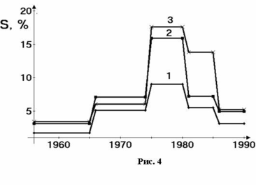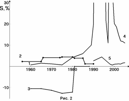 На рис.2 представлены данные для СССР, России – линия 1; ФРГ – 2; ГДР – 3; России в условиях современной стабилизации (2000 – 2006 г.г.) – 4; Германии – 5.