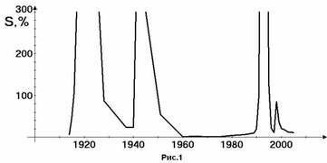 Изменение величины S на рис. 1 свидетельствует о правомерности аналогии использованной в работе [11] для величины энтропии-инфляции – экстенсивной функции экономической системы, сигнализирующей о приближении к «фазовому» переходу – социальной революции.