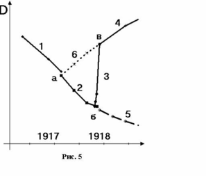 Поражают темпы возникновения и формирования Советов от первичных структур до Всероссийского центрального исполнительного комитета (ВЦИК) в 1917г. В июне 1917г. состоялся первый съезд рабочих солдатских депутатов. За 4 месяца при низкой грамотности населения, отсутствии средств связи и неразвитости инфраструктуры в огромной стране самопроизвольно, «снизу вверх», самоорганизовалась новая социально экономическая структура управления. Экстраполируя временной масштаб на современные условия развития страны можно говорить об одномоментности возникновения структур ССДС, что характерно для диссипативных структур, наблюдаемых в природе. Конкретизируем характерные признаки. Диссипативность структур подтверждается тем, что возникновение их осуществлялось в результате процесса самоорганизации за счет энергии среды. Естественно, что центральная власть не финансировала процесс организации Советов, а наоборот, препятствовала процессу инициирования новых самопроизвольных структур управления, развивающихся в нелинейной среде на локальных участках местности в противоположности к естественным процессам дезорганизации из-за смены центральной власти. Возникновение ССДС происходило в неустойчивой системе, поведение которой было чувствительно к малым возмущениям, к хаотическим флуктуациям на микро уровне и резко изменялось под их влиянием. Процесс происходил в режиме с обострением на конечном промежутке времени, в течение которого быстро развивался (см. рис. 1, 1917г.; рис. 5 ветвь 3).