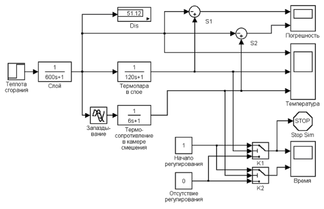 «Слой», «Термопара в слое», «Термосопротивление в камере смешения» – задают динамические характеристики кипящего слоя и термопреобразователей, принятые согласно [1 и 3];