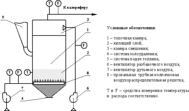 Как известно, температура ожижающего агента после прохождения его через слой имеет температуру слоя, если его высота более 20 эквивалентных диаметров составляющих частиц. Данное условие выполняется, так как высота кипящего слоя более 600 мм, а наибольший диаметр частиц – 13 мм. Таким образом, судить о температуре слоя можно по температуре продуктов сгорания Тпс.