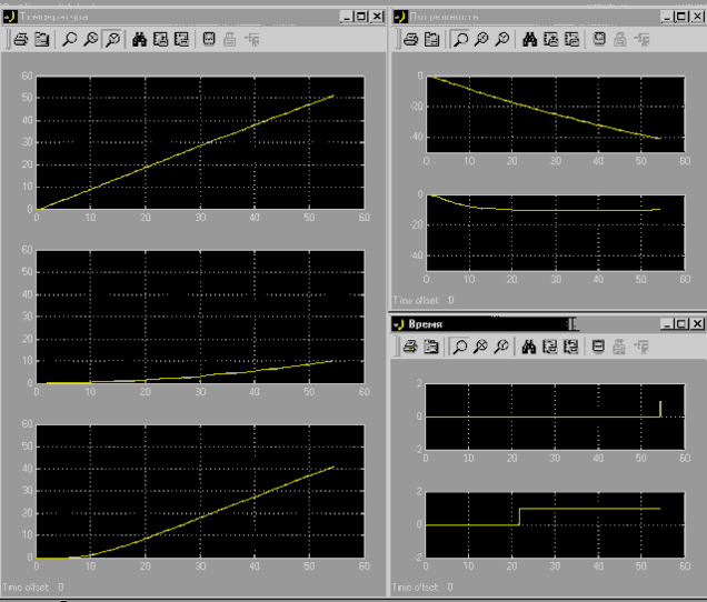 «Реакция системы управления» - определяет начало реагирования системы автоматизированного управления на изменение температуры при ширине зоны нечувствительности ±10°С и останавливает моделирование при начале реагирования системы с термопарой.