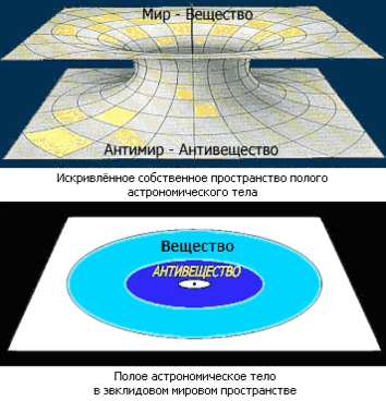При таком пространственном распределении напряженности гравитационного поля с уменьшением значения метрического радиального расстояния rметр фотометрический радиус r сначала уменьшается до своего минимального значения r0, а потом начинает возрастать внутри непустого собственного пространства этого тела. Физическая сингулярность (b0=0), которая всегда сопровождает метрическую сингулярность, имеет место при этом лишь в бесконечно малой окрестности поверхности с фотометрическим радиусом r0. Ввиду этого она фактически «размыта» квантовыми флуктуациями микронеоднородной структуры ПВК и, следовательно, физически не реализована. Такая «размытая» сингулярность не в состоянии исключить спорадическое взаимодействие между веществом внешней и внутренней части полого тела, благодаря возможности туннелирования формально абсолютно тонкого барьера, сформированного ею. Согласно квантово-механическим представлениям, движение вещества это – не механическое его перемещение, а постепенное изменение его пространственно-временных состояний. Поэтому то такая «размытая» сингулярная поверхность и не может быть абсолютно непреодолимым барьером также и для спорадического проникновения (квантового просачивания) вещества через нее.