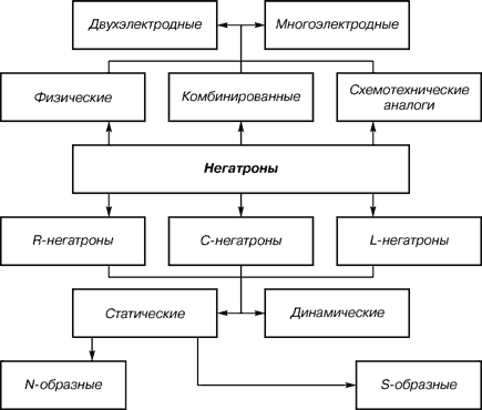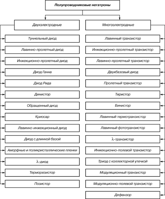 В настоящее время в области электроники развивается ряд научных направлений: квантовая электроника, оптоэлектроника, акустоэлектроника, хемотроника, магнитоэлектроника, криоэлектроника и др. В последнее десятилетие сформировалось еще одно направление – «Негатроника» [1...3]. Это направление электроники связанно с теорией и практикой создания и применения негатронов – электронных приборов, имеющих в определенном режиме отрицательное значение основного дифференциального параметра (отрицательных активного сопротивления, емкости и индуктивности) [4]. В настоящее время разработаны различные виды негатронов, обобщенная классификация которых представлена на рис. 1. Только полупроводниковых негатронов создано более двух десятков разновидностей (рис. 2). Среди них самые мощные сверхвысокочастотные (СВЧ) приборы – лавинно-пролетные диоды, самые быстродействующие ключи на лавинных транзисторах, самые мощные токовые полупроводниковые переключатели на динисторах и тиристорах. Однако развитие этого направления проходило неравномерно и, в отличие от классической транзисторной электроники, долгое время не имело систематизированной методологической и теоретической базы. И только в 1985 году [1] была дана формулировка этого научного направления. Целью данной статьи является попытка кратко рассмотреть историю развития «Негатроники».