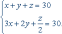 Исключив z и выразив затем x через y, получим x = 6 – 3/5 y. Единственное возможное значение y равно 5, тогда x = 3, z = 22.