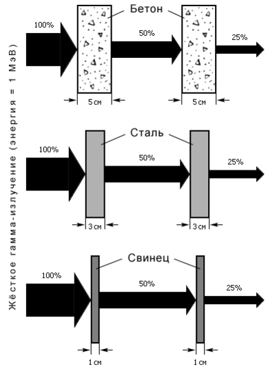 Так в физике защиты от излучений называют толщину того или иного материала, после прохождения которого интенсивность гамма-излучения уменьшается наполовину. Полного поглощения гамма-излучения (с энергией ниже 10 МэВ) в веществе не происходит, однако интенсивность потока гамма-квантов ослабляется по экспоненциальному закону, в точности такому же, как закон радиоактивного распада. При этом роль периода полураспада играет слой половинного ослабления. Для жесткого гамма-излучения с энергией квантов 1 МэВ толщина этого слоя составляет 5 см бетона, 3 см стали или 1 см свинца. Если необходимо уменьшить интенсивность опасного гамма-излучения в миллион раз, то потребуется свинцовый экран толщиной 20 см либо бетонная стенка метровой толщины (220 примерно равно 106). 10 см свинца ослабляют жесткое излучение в тысячу раз. Для сравнения: альфа-излучение с энергией 1 МэВ практически полностью поглощается алюминиевой фольгой толщиной 5 микрон, а для поглощения бета-радиации с такой же энергией достаточно 1,6 мм алюминия.