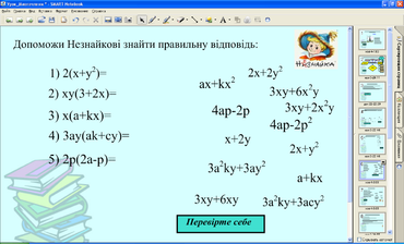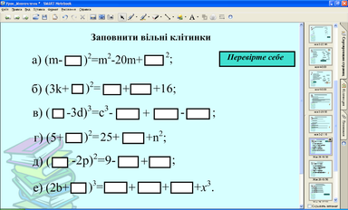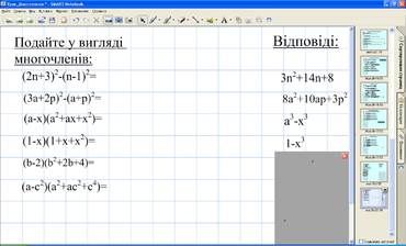 Нами розроблено декілька уроків та систем завдань з тем «Вивчення многочленів» та «Формул скороченого множення». За для цього спочатку ми відкрили програму Notebook і на вкладці «Колекція» вибрали фон, потім використовуючи спеціальний інструмент для введення тексту з клавіатури ввели текст завдання.