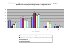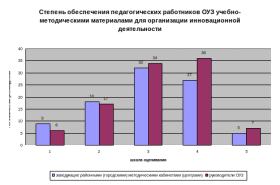 Материально-техническое оснащение инновационных процессов по автономии в среднем составляет 38% (2004г. – 22%). По оценке респондентов степень учебно-методического обеспечения, материально-технического оснащения составляет 3,5 и 2,5 балла соответственно (диаграммы 6,7).