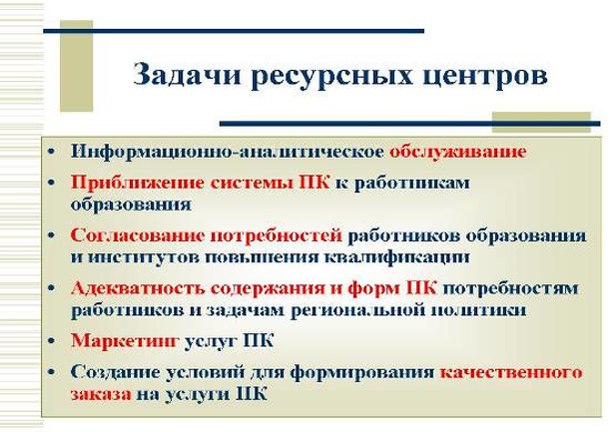 Ресурсный центр реализует также функции методического, информационного и консультационного центра для работников образования (они могут стать филиалами институтов повышения квалификации).