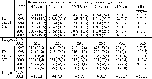 Заметны различия в динамике возрастных групп. При общем росте числа осужденных по ст.132 в 1997-2002 г. на 88,6%, количество несовершеннолетних за этот период выросло в 2,2 раза, а лиц в возрасте 50-59 лет – в 3,2 раза. В то же время, на фоне общего снижения числа осужденных по ст.131 на 24,4%, наибольшее снижение отмечается в группе старших возрастных групп и лиц в возрасте 25-29 лет.