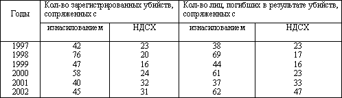 Одной из неблагоприятных тенденций в характеристике преступлений рассматриваемого вида является некоторый рост числа убийств, сопряженных с НДСХ. Количество же лиц, погибших в результате таких преступлений в 2002 г. достигло в абсолютном выражении рекордного показателя – 47 чел. (см. табл.3).
