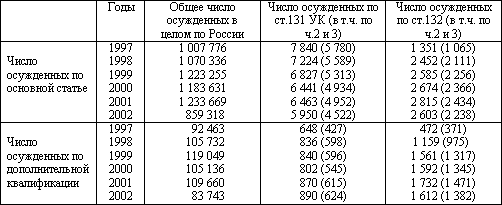 В 2002 г., например, по ст. 132 УК было осуждено 2 603 лица, у которых эта статья являлась основной статьей обвинения и еще 1 612 чел., у которых ст.132 выступала в качестве дополнительной квалификации. Доля последних в общем числе осужденных по ст.132 составляла, таким образом, 38%, что в несколько раз превышает как процент осужденных за изнасилование, у которых ст.131 являлась дополнительной квалификацией (их в среднем 13%), так и долю осужденных в целом, имеющих дополнительную квалификацию (их доля не превышает 9%).