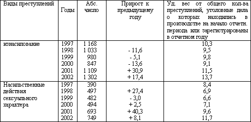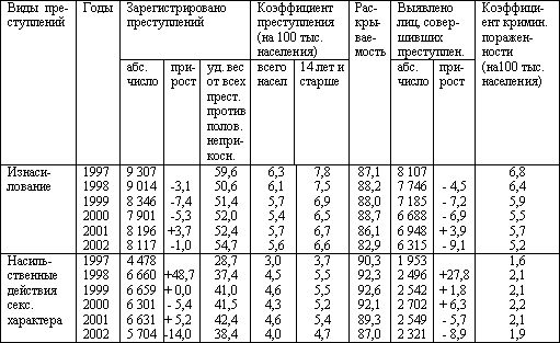 При характеристике изменений преступности в России, помимо сведений о преступлениях против жизни и здоровья, принято приводить данные о количестве лишь зарегистрированных изнасилований, которое с 1997 г. постепенно снижается. Это, однако, дает неверное представление о действительном состоянии и динамике всей насильственной сексуальной преступности. При сложении числа зарегистрированных изнасилований и НДСХ оказывается, что динамика совокупности таких преступлений почти не меняется – за период 1997-2002 г. прирост составил 0,3% (см. табл. 1).