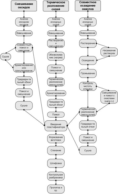 Ко второй группе относятся, например, разложение металлоорганических соединений (МОС), различные варианты осаждения из растворов, упаривание солевых растворов, осаждение за счет реакций в газовой фазе, конденсация паров, криохимический метод, распылительная сушка и т.д. Особенностью получения порошков таких материалов, как сложные оксиды, является то, что в его ходе часто протекают химические реакции разложения исходных веществ (солей, органических соединений, гидроксидов и т.п. термически непрочных форм), а далее осуществляется твердофазный синтез фаз заданного состава. Методы получения компактных сложнооксидных материалов можно подразделить на собственно керамические и методы с использованием растворных (в частности, солевых) технологий (Таблица 1).