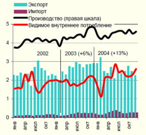 | Российские металлургические предприятия способны полностью закрыть потребность внутреннего рынка в рядовом прокате. Сегодня Россия потребляет примерно половину выплавляемой стали. По итогам 2004 года был показан существенно больший, чем в предыдущие годы рост внутреннего потребления (13%) (рис. 3). Однако значительная часть этого прироста может объясняться ростом складских запасов у трейдеров и потребителей, обусловленным практически непрерывным ростом цен. Поэтому по итогам 2005 года мы ожидаем более скромных значений прироста внутреннего потребления. В целом рост внутреннего потребления стоит рассматривать как базу дальнейшего роста производства в металлургии. Однако оценить потенциал этого роста достаточно сложно. Существуют различные методики расчета коэффициента прироста металлопотребления к ВВП (величина прироста в процентах на 1% роста ВВП), например для развивающихся экономик коэффициент роста потребления стали больше 1 (например, в Китае на 1% роста ВВП — более 2% роста потребления стали). По оценкам компании PriceWaterhouseCoopers, для Польши, структура экономики которой может быть с определенными допущениями соотнесена с российской, рост металлопотребления на 4% меньше, чем рост ВВП. | Рисунок 3 Видимое внутреннее потребление стального проката (производство + импортэкспорт), млн т Источник: ГКС |