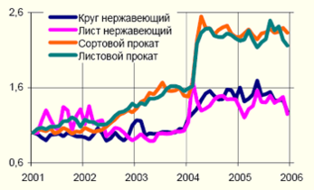 | Рисунок 5 Сопоставление цен на нержавеющий и рядовой прокат Источник: «Русмет» | Однако большинство положительных тенденций концентрируется в сфере производства рядовых сталей общего назначения. Потребление специальных сталей и сплавов в России растет гораздо более медленными темпами, особенно это касается нержавеющих сталей — самого массового вида металлопродукции специального назначения (рис. 5). Рост цен на нержавеющие стали в значительной степени отставал от роста цен на рядовые стали. При этом стоимость основных легирующих элементов (никеля, хрома марганца) росла достаточно быстрыми темпами. Это привело к постепенному снижению рентабельности производства нержавеющих и других высоколегированных сталей. Кроме того, предприятия, которые могли выпускать одновременно высокорентабельные рядовые стали и низкорентабельные специальные стали, постепенно наращивали выпуск первых и снижали производство вторых. В результате на рынке постепенно расширялась ниша, занимаемая импортными сталями, производители которых, прежде всего в силу значительно больших объемов производства, имели возможность поставлять их по более конкурентным ценам. |