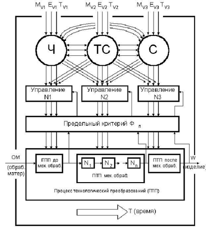 В качестве операторов системы технологических преобразований выступают: Ч - человеческий фактор (к этой категории можно отнести, в зависимости от степени детализации проработки системы, конструкторов изделий, технологов, станочников и т.д.); ТС - технологические системы, в которых реализуются технологические процессы, включающие следующие стадии технологических воздействий: N1 - до механической обработки (получение заготовки), N2 - в период механической обработки, N3 - после механической обработки; С - среда, влияющая на состояние всей совокупности рассматриваемых объектов системы. В свою очередь, при реализации всех видов технологических преобразований операторы системы испытывают воздействие внешних потоков материального Мvi, энергетического Еvi и информационного Ivi характера.