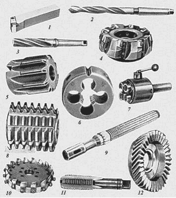 1 – резец с механическим креплением пластинки твёрдого сплава; 2 – винтовое сверло; 3 – зенкер с коническим хвостовиком, оснащенный твердосплавными пластинками; 4 – торцевая насадная фреза со вставными ножами, оснащенными твёрдым сплавом; 5 – машинная развёртка с твердосплавными пластинками; 6 – плашка; 7 – винторезная головка с круглыми гребёнками; 8 – червячная фреза; 9 – шлицевая протяжка; 10 – резцовая головка для обработки конических колёс с круговым зубом; 11 – метчик; 12 – зуборезный долбяк со спиральными зубьями.